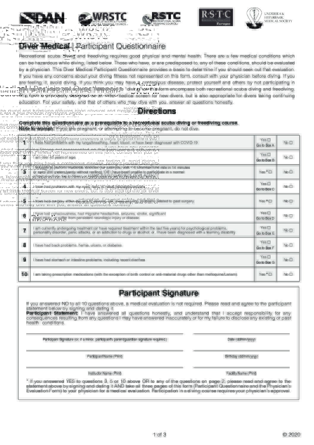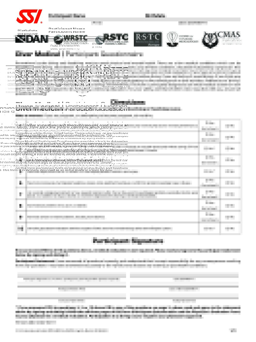 Before enrolling in a class, you should take time to read and review the Diver Medical Statement Participant Questionnaire. The first page has If you have any YES answers on that page, review the associated section on the second page. If you have any YES responses on page 2 you’ll just need to get a doctors’ sign-off (on the Physicians Approval to Dive form) before you can participate in ANY in-water activities. It’s important to note if a physician’s signature is required, only a medical doctor’s (MD or DO) signature will be accepted per agency rules (no NP or PA signatures).