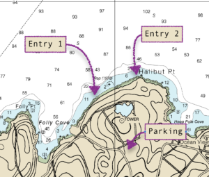 The shoreline in Halibut is highly exposed to wind and waves and can be quite dramatic when winds blow out of the north. It is wise to avoid this site on all but the calmest days. You should always take the time to walk up to shore to scout the site before committing to a dive here. You can always bail out to nearby Folly Cove if conditions are not ideal and the wind/waves are not out of the NE.