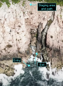 The safest, though still challenging exit is to work your way up a series of ledges along the East side of the chasm. This exit requires significant skill and experience to perform, even during days with flat seas. The ledges are covered in black Calothrix bacteria which is extremely slippery when wet. Stick to the barnacles and cracks to improve your traction.