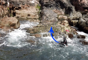 The easiest entry is a giant stride off of the rock to the West of the chasm (head to the right when you reach the top of the chasm). Work your way to the prominent rock at the mouth of the chasm where you can safely perform a giant stride entry in deep water.