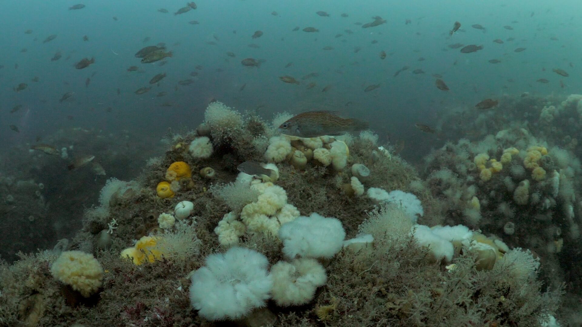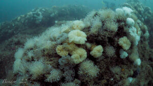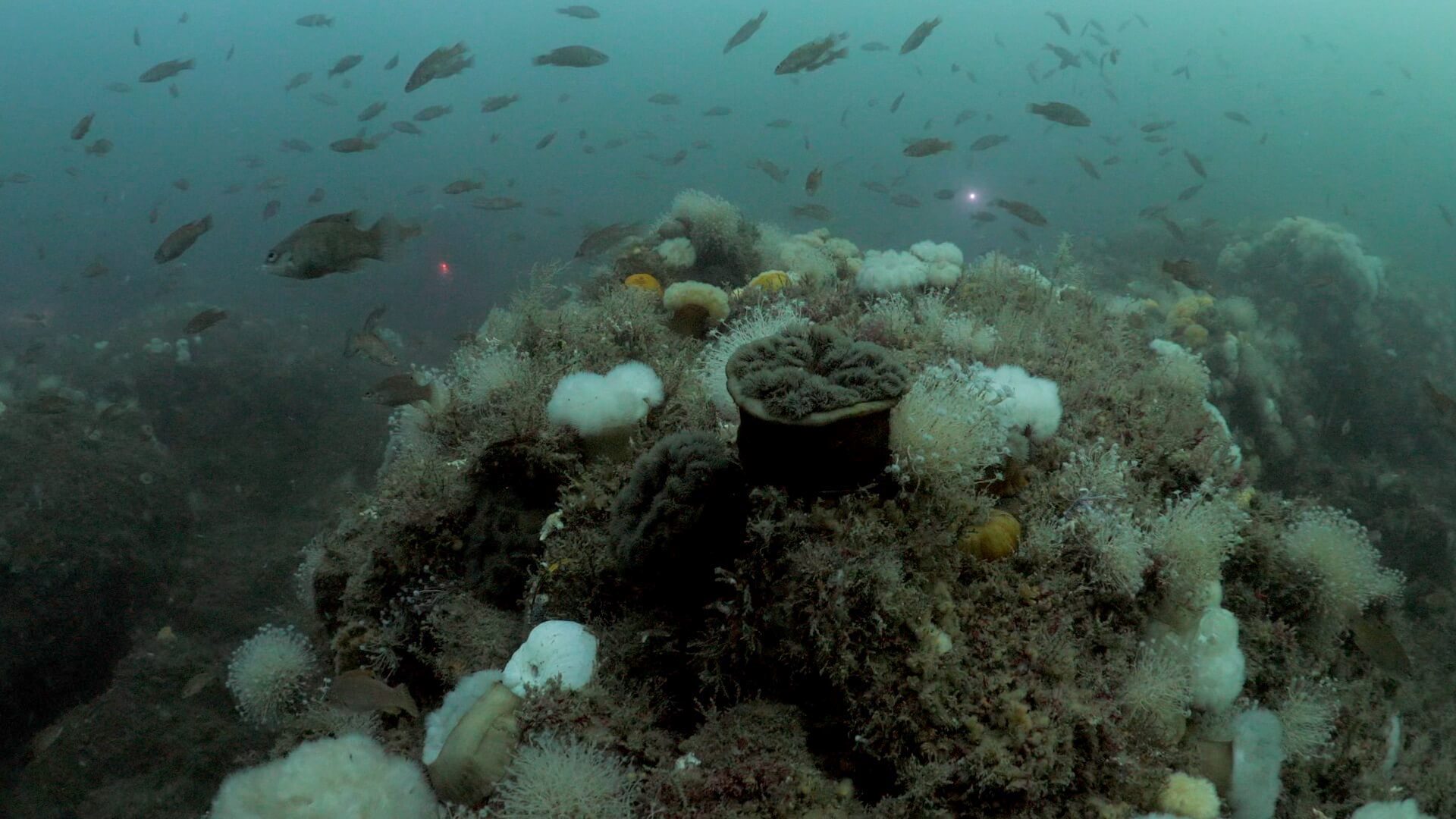 The topography attracts numerous invertebrate and fish species who pull plankton from the water column. You’ll alway encounter frilled anemone, tubularian hydroids, and cunner, but keep an eye out for longhorn sculpin, wolffish, and red anemones which are frequently spotted at the site.