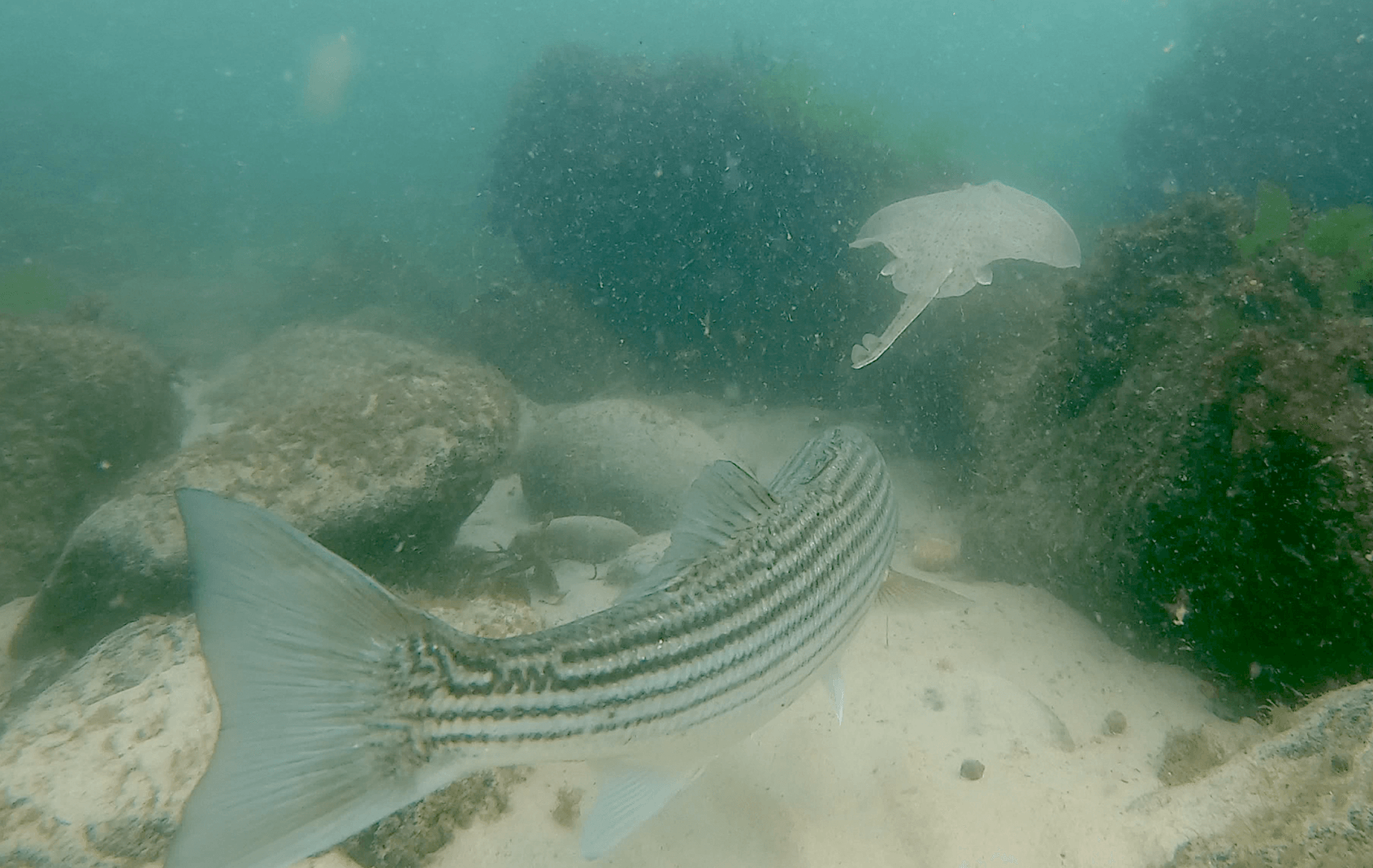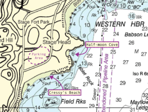 There are two dive sites in the park, Cressy’s Beach (to the south) and Half-moon Cove (to the east). Cressy is frequently used for training and diving related events. The bottom is almost entirely sand with a few scattered rocks here and there and little in the way of sea life. The most interesting area is around the rocks sloping into the water from the surface directly to the left (east) of the Cressy’s Beach entry and exit point or right (south) of the Half-moon Cove entry. It’s not deep here, only 10-15 feet. But the rocks are closely spaced and are home to some invertebrate life. They’re also the most likely place to find any fish that have wandered this far into the harbor. The site can be a great place to go for training purposes, especially if the weather has blown out any alternative locations on Cape Ann.